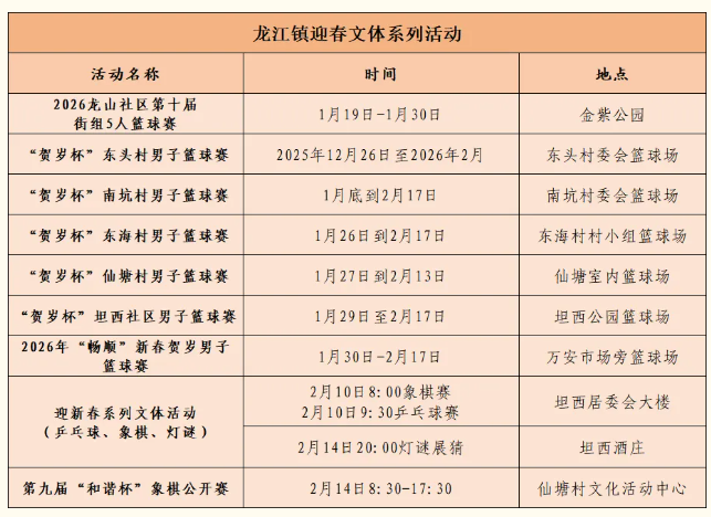 龙江镇各村(社区)文体氛围浓厚,每年春节期间都会开展篮球、象棋、乒乓球、灯谜等系列群众喜闻乐见的活动,用一场场精彩的赛事比拼,营造浓厚的节日氛围,增强全民身体素质和凝聚力。