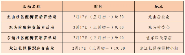 醒狮贺新岁活动是龙江镇龙山社区、东头村、东涌社区的传统开年活动,届时将有舞狮与武术表演。同时龙江社区横滘小组有大年初一舞夜龙的传统,夜龙随着锣鼓声翩翩起舞,热闹非凡。