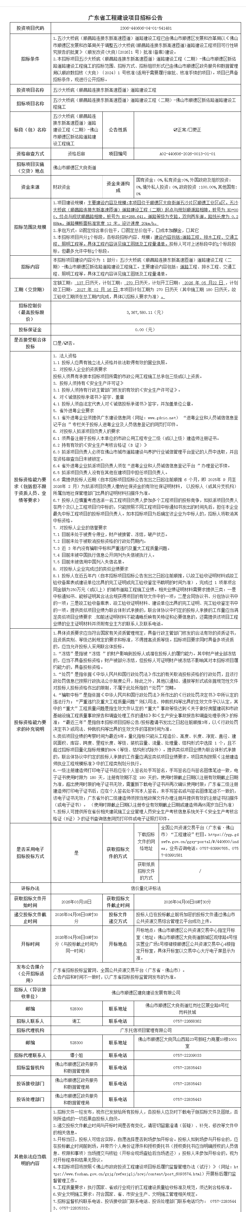 概述:本招标项目五沙大桥底(顺昌路连接东新高速匝道)道路建设工程(二期)-佛山市顺德区新佑路道路建设工程施工的招标范围、招标方式......