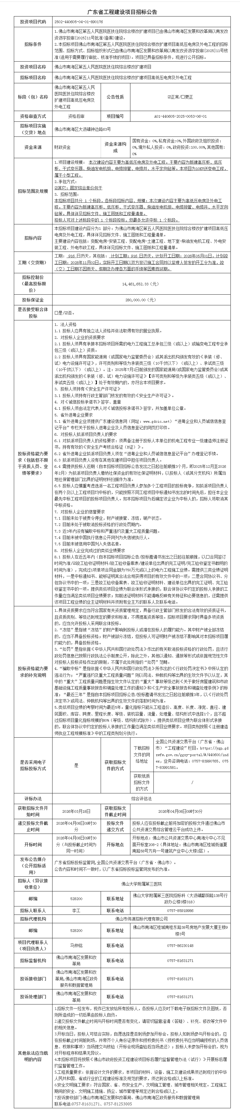 佛山市南海区第五人民医院医技住院综合楼改扩建项目高低压电房及外电工程招标红公告