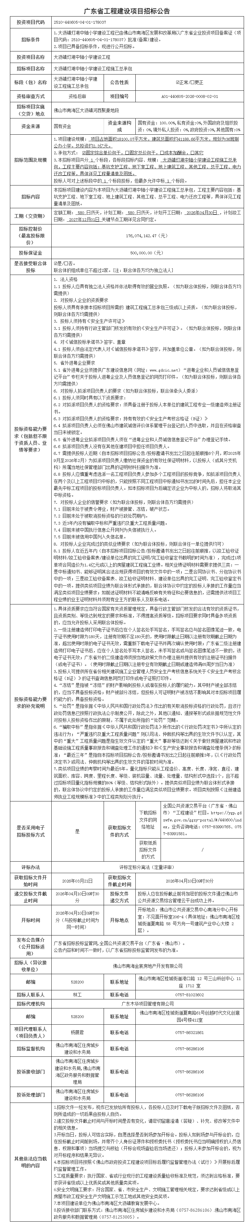 南海大沥镇灯湖中轴小学建设工程施工总承包招标公告