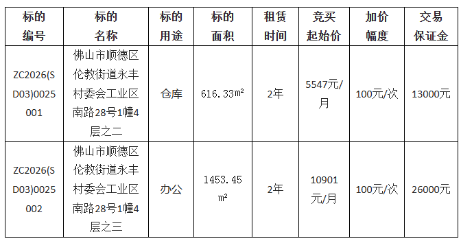 1.项目名称:佛山市顺德区伦教街道永丰村委会工业区南路28号1幢4层之二等两宗物业公开招租项目