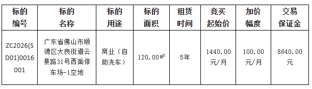 佛山市顺德区大良德良物业管理有限公司采用网上竞价方式出租位于佛山市顺德区大良街道云景路31号西面停车场-1空地物业,欢迎符合资格的竞买人参与竞价。