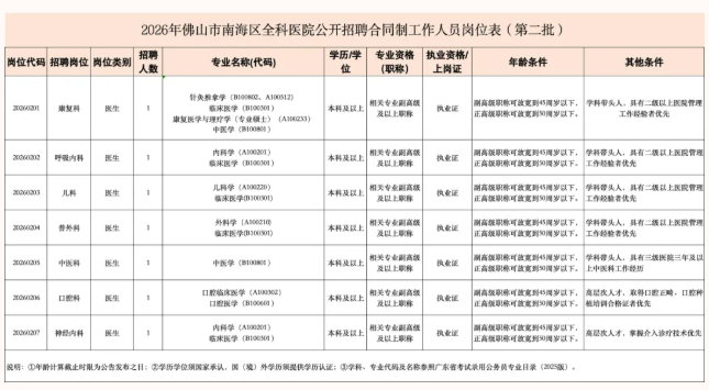 9.具备报考岗位所需其他条件。具体见附件1:2026年佛山市南海区全科医院公开招聘合同制专业技术人员岗位表(第二批)。