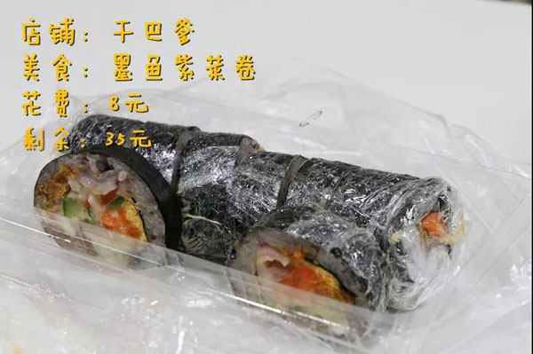 第二站小编来到“干巴爹”点了一份墨鱼紫菜卷。青瓜、萝卜、墨鱼仔,加上糯糯的米饭和爽脆的紫菜,一口咬下去,超满足!除了紫菜卷,这里还有鸡蛋仔和各式饮品任君选择。
