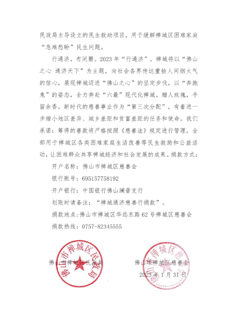 “‘通济慈善行’来源于佛山文化地标通济桥,取‘行通济,做善事’之意……现我们向社会各界诚恳发出倡议,期望您积极响应号召,慷慨解囊,积极参与募捐活动中来。”日前,禅城区民政局、区慈善会公开发布了相关的善款募集倡议书,号召市民通过线上线下方式进行捐款。筹集善款将全部注入区慈善会“民生救助金”项目,用于缓解禅城区困难家庭“急难愁盼”民生问题。