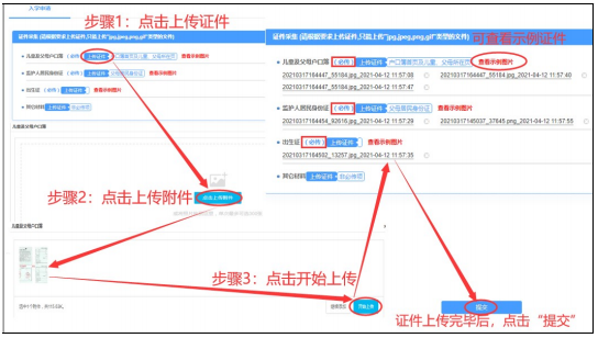 (四)证件采集:家长根据要求上传证件,上传完毕并【提交】就能完成报名。