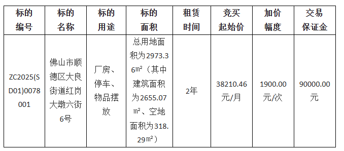 佛山市顺德区大良德良物业管理公司采用网上竞价方式出租位于佛山市顺德区大良街道红岗大墩六街6号,欢迎符合资格的竞买人参与竞价。