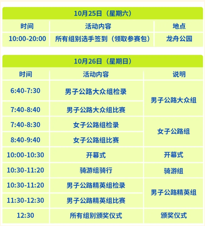 2.骑游组选手须于2025年10月25日(赛前一日)前往指定地点完成报到手续,领取参赛包及号码布,赛事当日2025年10月26日不设骑游组选手签到时间。
