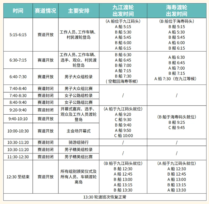 登岛/离岛人员安排:除嘉宾、工作人员、运动员、预约观众、海寿村民外,其他人员暂缓登岛。离岛人员非必要,尽量指引在12:30赛后离岛。