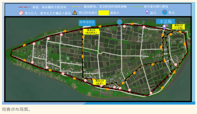 (3)赛事当日7:40-12:30海寿岛赛道实行严格封路措施。所有参赛选手、工作人员及授权车辆须凭有效证件通行,无关人员及车辆须服从现场交通指挥,绕行其他道路。