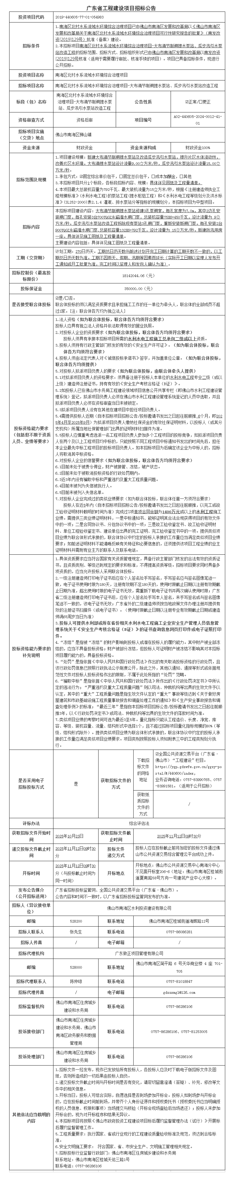 南海区北村水系流域水环境综合治理项目-大布涌节制闸提水泵站、瓜步汛引水泵站改造工程招标公告