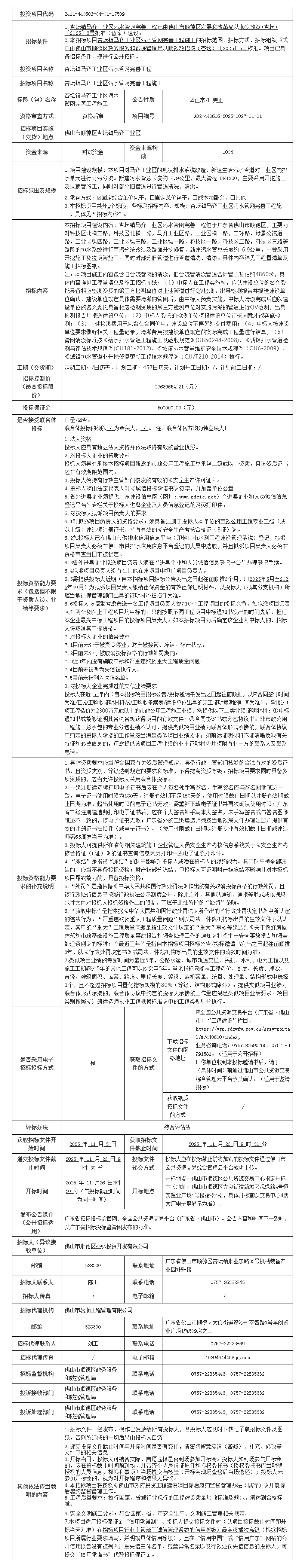 顺德杏坛镇马齐工业区污水管网完善工程施工招标公告