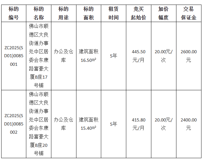 佛山市顺德区景良投资发展有限公司采用网上竞价方式出租位于佛山市顺德区大良街道办事处中区居委会东康路富豪大厦B座17号铺等2宗物业,欢迎符合资格的竞买人参与竞价。
