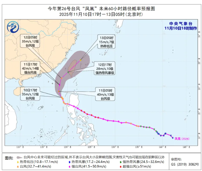 今年第26号台风“凤凰”的中心11月10日17时位于台湾岛鹅銮鼻南偏西方约500公里的南海中东部海面上,中心附近最大风力有12级(35米/秒)。受其影响,11月11日广州南站往湛江、珠海方向部分列车停运。受台风和弱冷空气共同影响,11月11日—13日佛山风速增大,最低气温预计重回“1”字头。