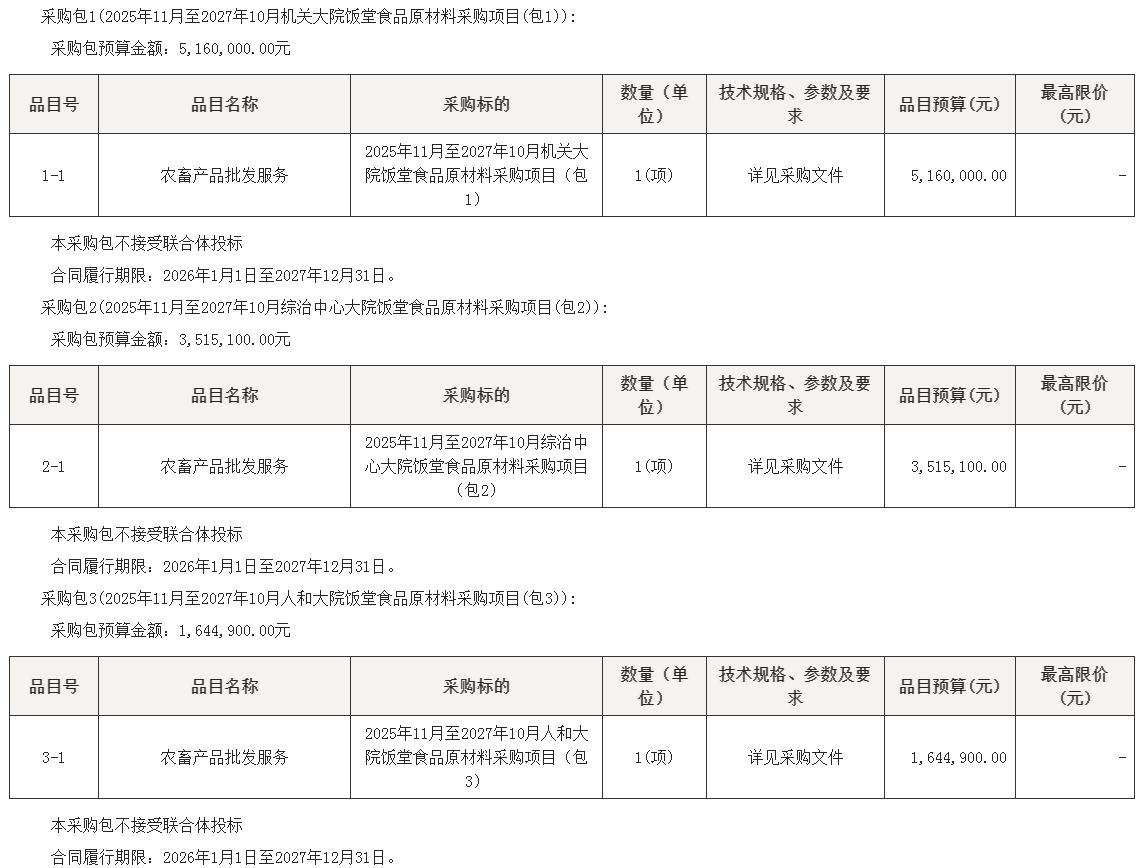 2025年11月至2027年10月机关饭堂食品原材料采购项目招标公告