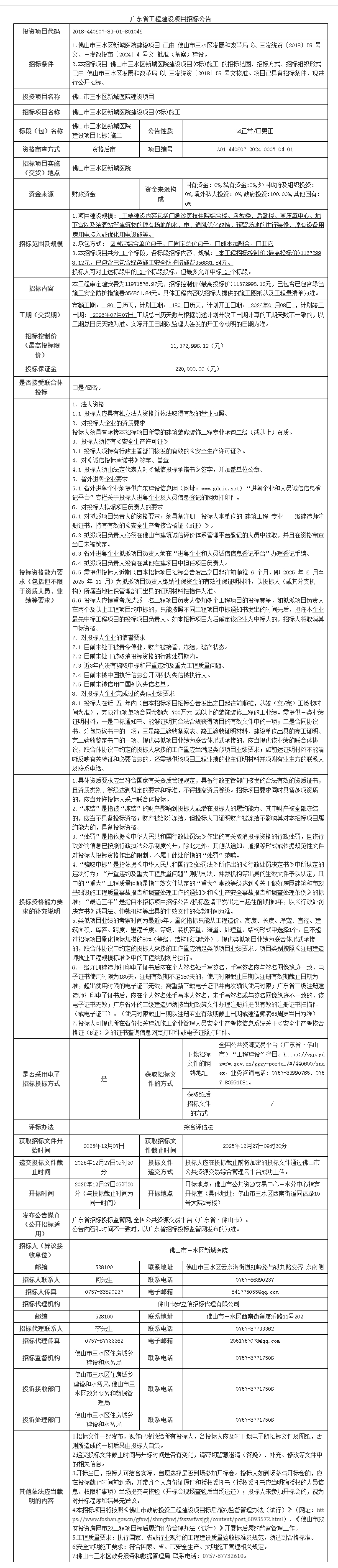 佛山市三水区新城医院建设项目(C标)施工招标公告