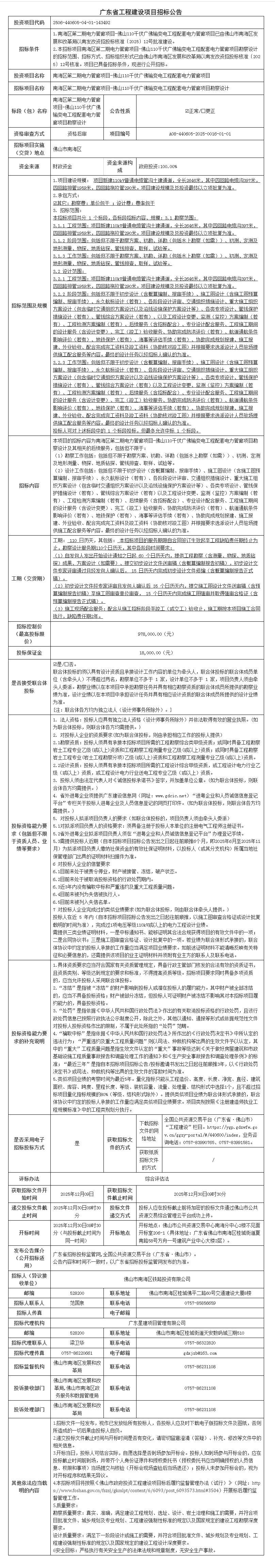 南海区第二期电力管廊项目-佛山110千伏广佛输变电工程配套电力管廊项目勘察设计招标公告