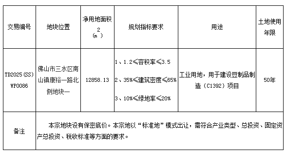 交易编号:TD2025(SD)XG0008,本项目位置:佛山市顺德区伦教街道奋扬路以南、世龙大道以东地块,宗地图号:148065-013(1),用地面积为31446.16平方米(折合47.17亩),土地使用性质:一类工业用地(M1)兼容物流仓储用地(W);其中:A区面积为7985.42平方米(折合约11.98亩);B区面积为23460.74平方米(折合约35.19亩),详见 “分区示意图”,以最终可供地的面积为准。地块的用地面积、规划指标及建设开发要求详见《佛山市顺德区伦教街道奋扬路以南、世龙大道以东地块改造权交易项目协议》、《佛山市顺德区建设用地规划条件》(初稿)及《投资开发建设协议》(初稿),地块的规划指标和经济投资指标最终按批复的控制性详细规划和《投资开发建设协议》实施。