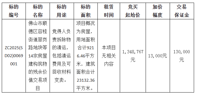 1.项目名称:佛山市顺德区容桂街道翠岗路地块等14宗房屋建构筑物的残余价值交易项目