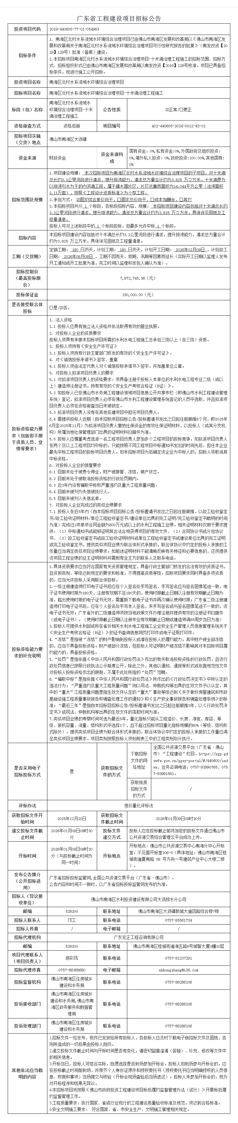 南海区北村水系流域水环境综合治理项目-十米涌治理工程施工招标公告