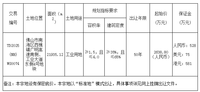 经佛山市人民政府批准,佛山市自然资源局决定委托佛山市公共资源交易中心南海分中心采用网上挂牌方式出让下列地块的国有建设用地使用权。现将有关事项公告如下:
