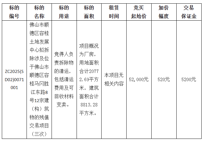 1.项目名称:佛山市顺德区容桂土地发展中心拟拆除涉及位于佛山市顺德区容桂马冈胜江东路8号12宗建(构)筑物的残值交易项目(三次)