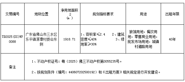 概述:经佛山市人民政府批准,受佛山市自然资源局(以下称委托人)委托,本中心(以下称拍卖人)现采用网上拍卖方式出让以下地块的国有建设用地使用权......