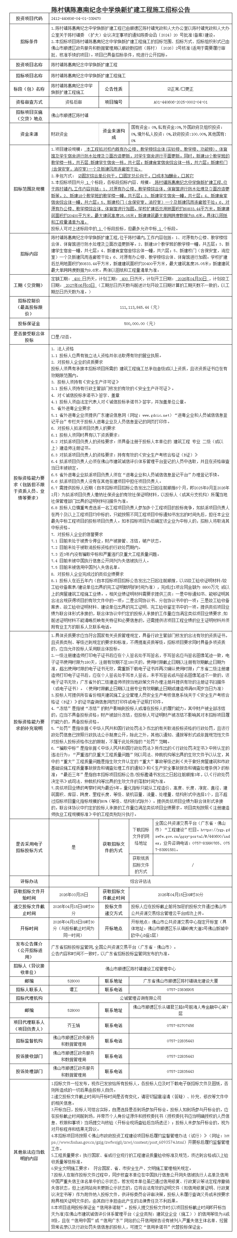 顺德陈村镇陈惠南纪念中学焕新扩建工程施工招标公告