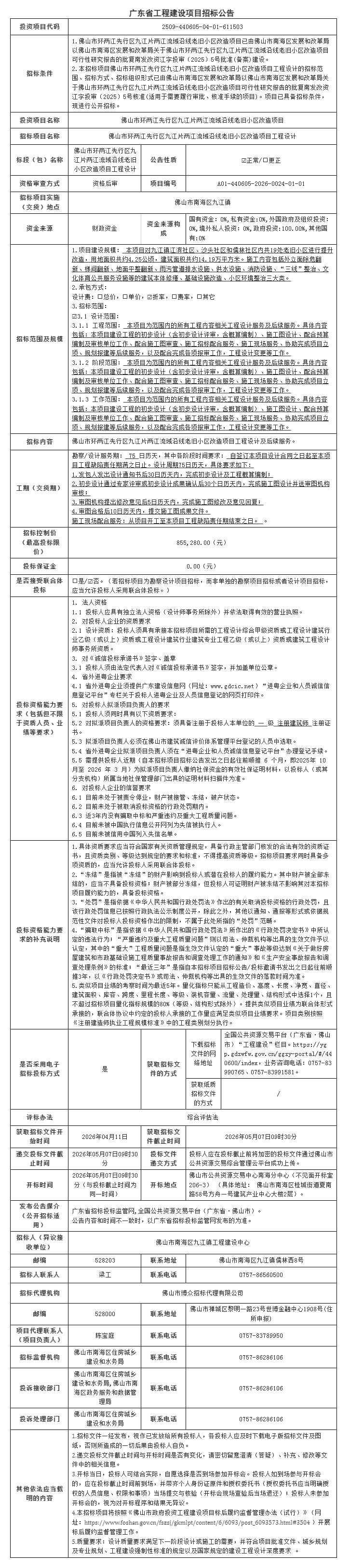 佛山市环两江先行区九江片两江流域沿线老旧小区改造项目工程设计招标公告